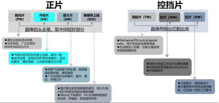 5、根据功能的不同,硅片可划分为正片和控挡片/测试片。其中正片指的是用于正式生产的、最终形成晶圆成品的硅片,具体又包括抛光片和在抛光片基础上进一步处理形成的外延片、退火片等,各自具有不同的特性和应用;而控挡片/测试片则指的是用于测试、暖机、工艺调整、监测稳定性等用途的硅片,通常其品质要求和价值量相较正片都会更低一些。因此,一般单晶硅棒中间较好的部分会用来制作正片,而两侧品质相对较差的头尾部分则可用来制作控挡片/测试片。